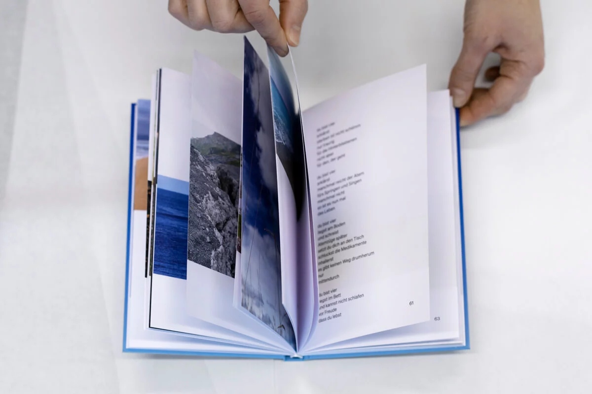 Umschlag: Offsetdruck 2-farbig Pantone Dunkelblau und Weiss auf hellblaues Papier