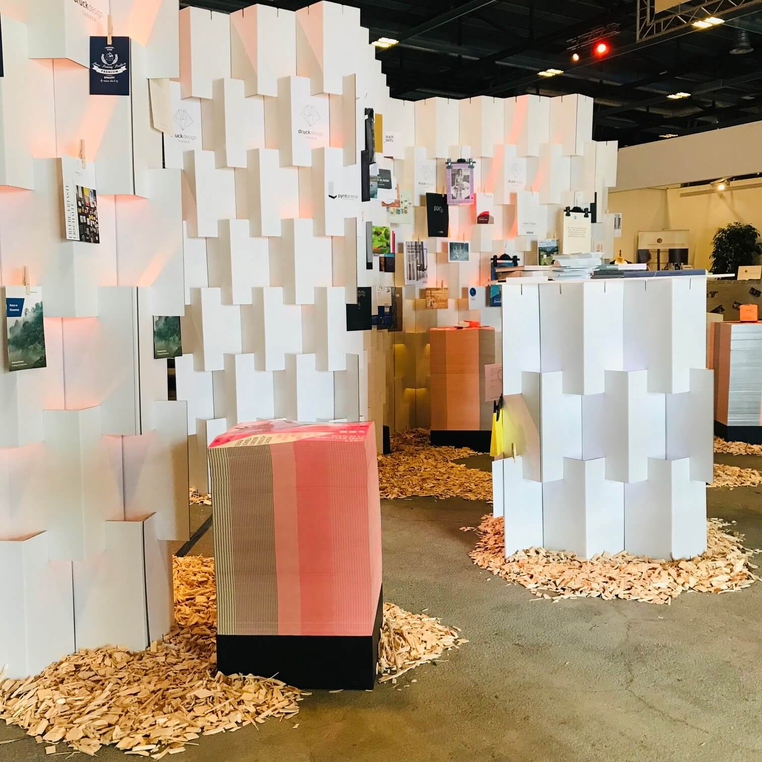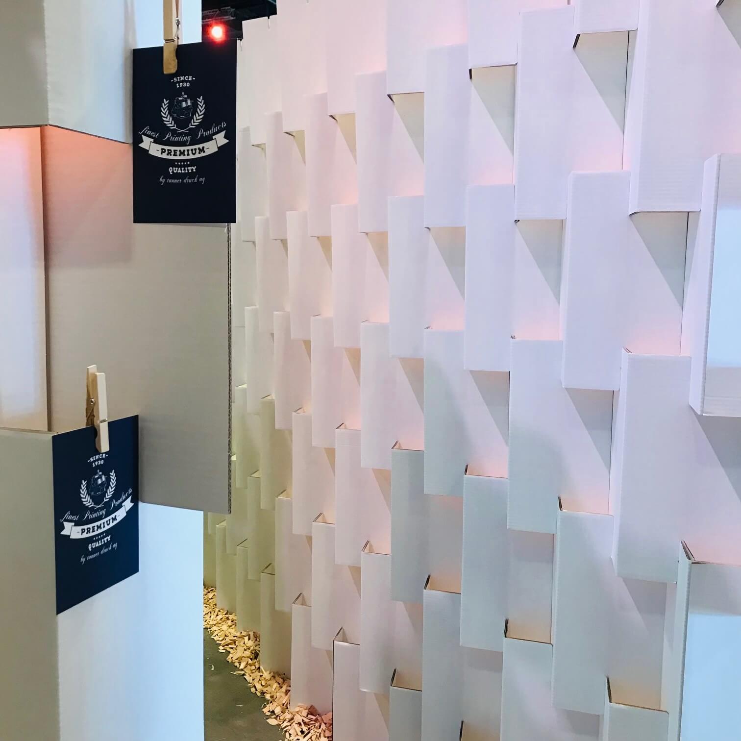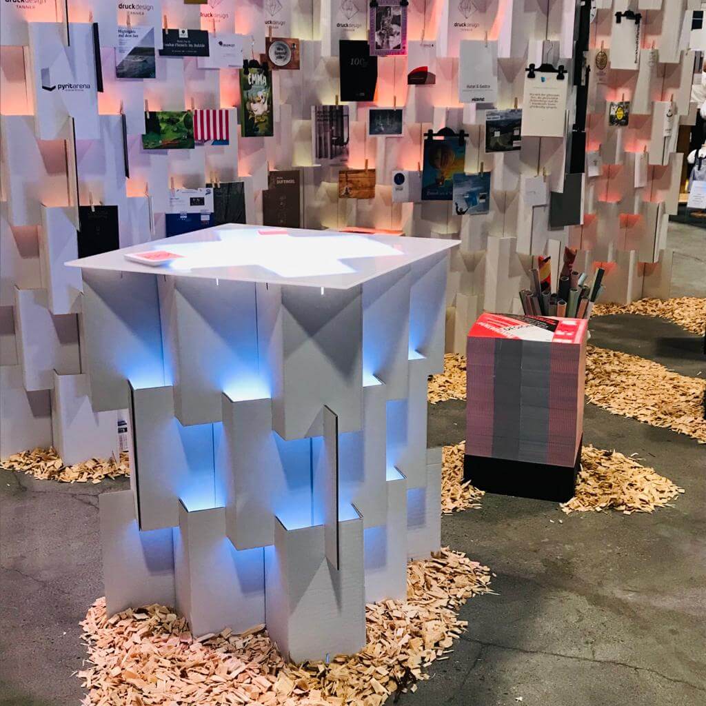Unser Bio-Lego wurde geschickt mit LED ausgeleuchtet und diente zugleich als Werbeträger, Besprechungstisch und spannendes Labyrinth für die Kinder. Die Karton-Stellwand stand mitten im Geschehen und hat eindrücklich bewiesen, dass nachhaltige Lösungen auch im Messealltag überzeugen. Stabil, hochwertig im Look und schnell aufgebaut – ebenso schnell wieder abgebaut. Platzsparend verstaut und bereit für den nächsten Event.