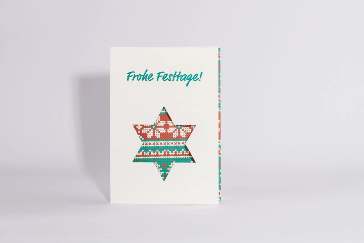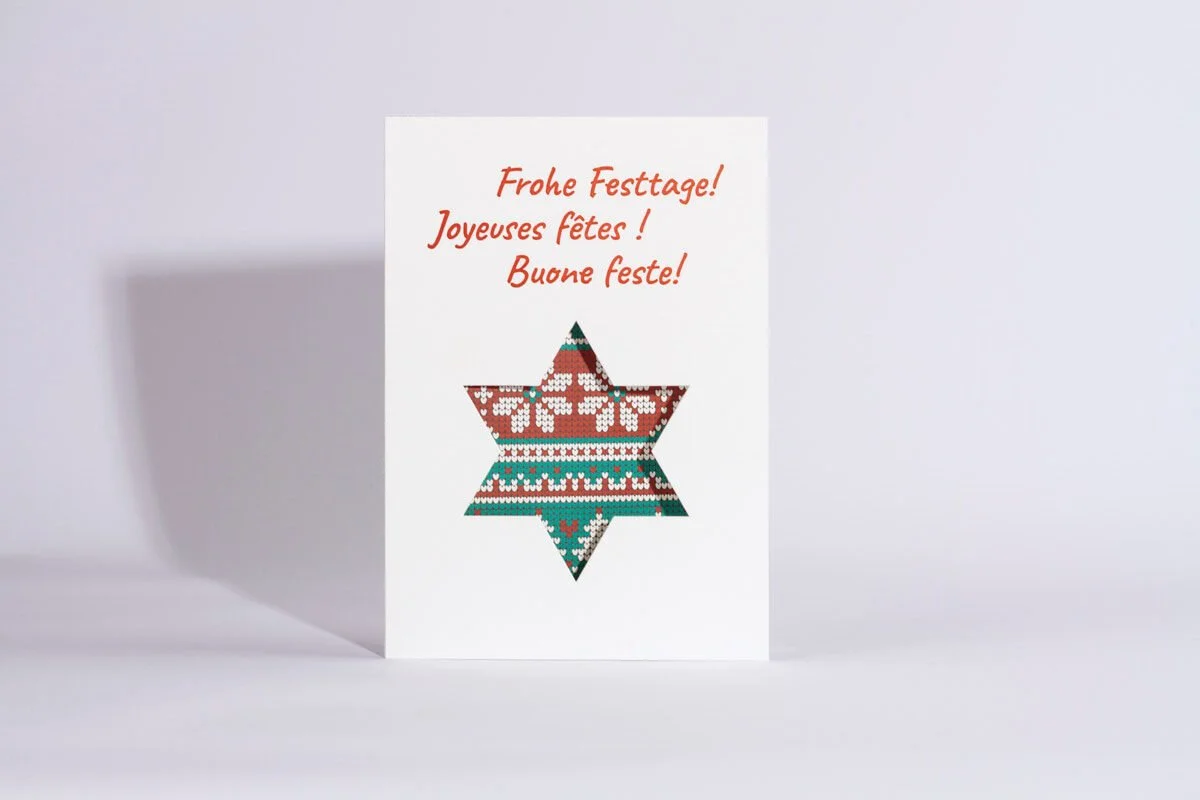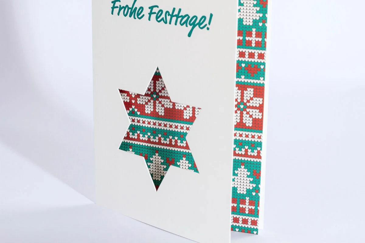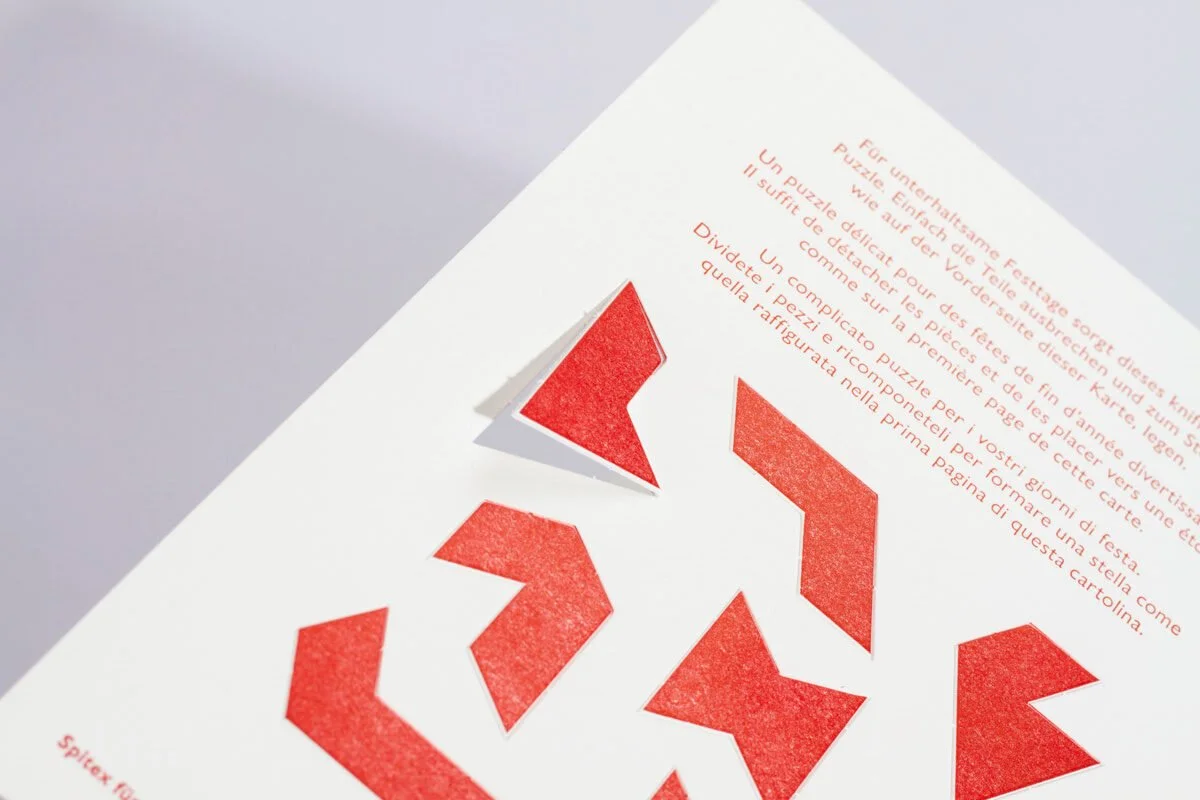 Druck mit Pantone im Letterpress auf voluminöses, haptisches Papier, Stern und Legespiel ausstanzen, Einlageblatt im Offsetdruck